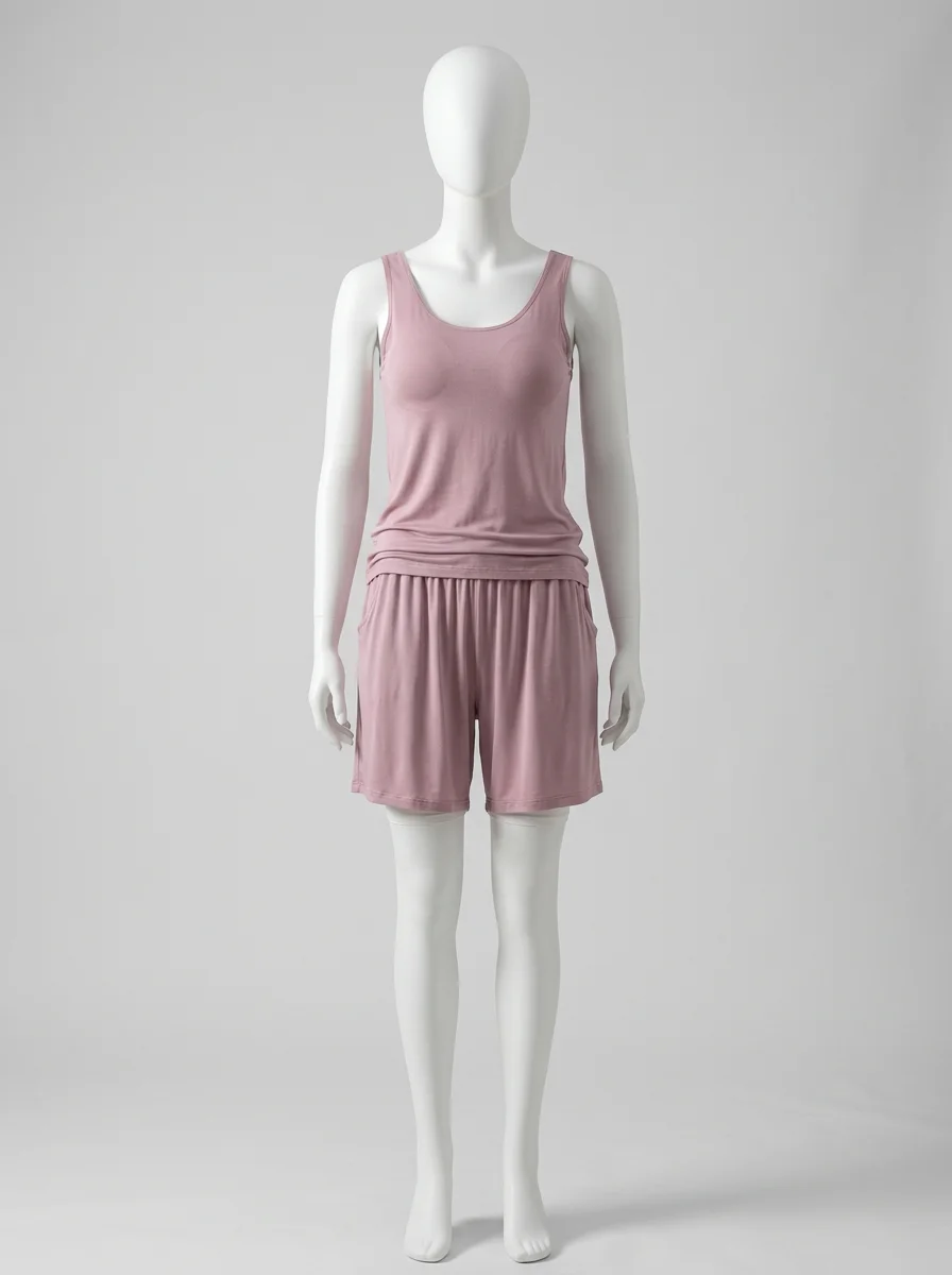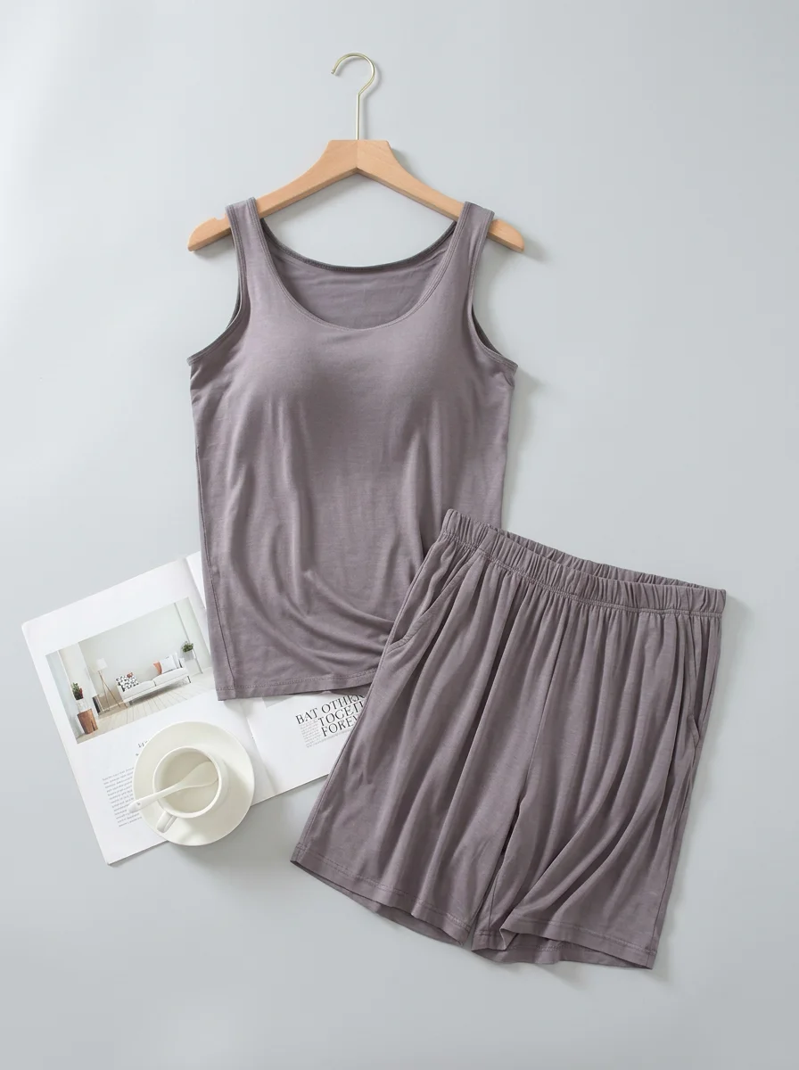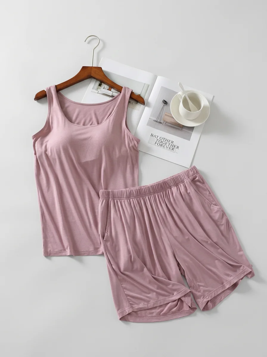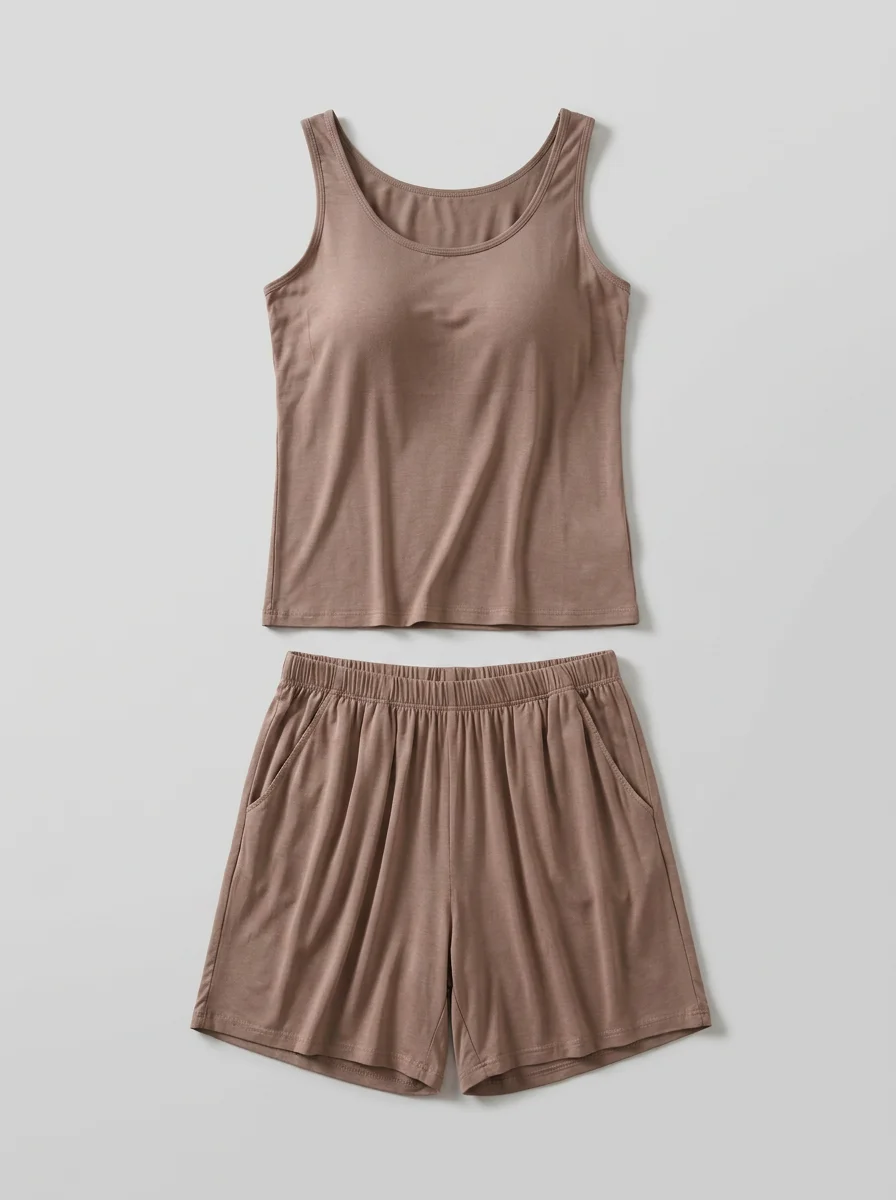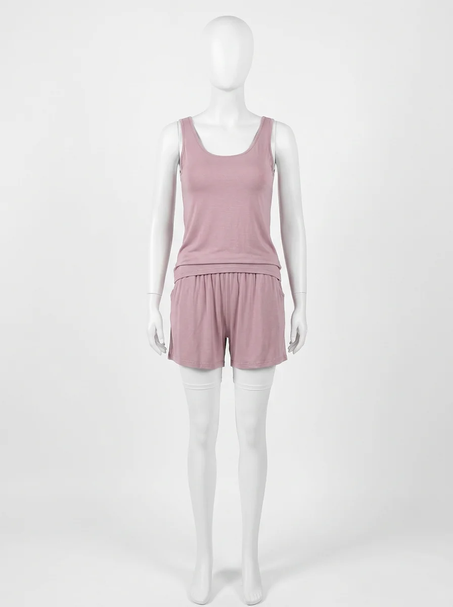 Un Pyjama short et viscose offre une liberté de mouvement totale tout en assurant un maintien discret grâce à un haut rembourré. Les matières respirantes garantissent une fraîcheur idéale durant les périodes estivales.